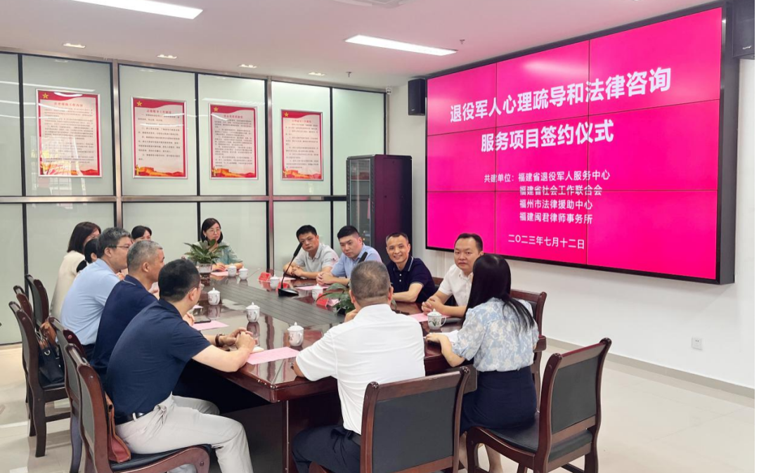 7月12日上午,在省退役軍人事務(wù)廳指導(dǎo)下,在省司法廳大力支持下,省退役軍人服務(wù)中心與省社會工作聯(lián)合會、福州市法律援助中心、福建閩君律師事務(wù)所舉辦“退役軍人心理疏導(dǎo)和法律咨詢服務(wù)項目”簽約儀式。