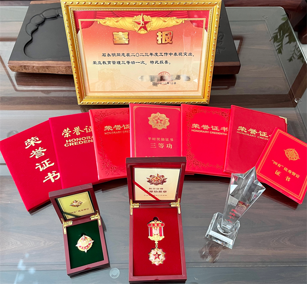 現(xiàn)役軍人石永明獲得的榮譽(yù)證書、獎(jiǎng)?wù)?、?jiǎng)杯 “作為一名軍嫂,更加理解軍人的艱辛與不易,我永遠(yuǎn)是他最堅(jiān)實(shí)的后盾,希望他能全身心扎根軍營(yíng),為國(guó)防事業(yè)添磚加瓦?!苯舆^滿載著榮譽(yù)的喜報(bào),石永明的妻子許佳莉喜悅與自豪之情溢于言表。