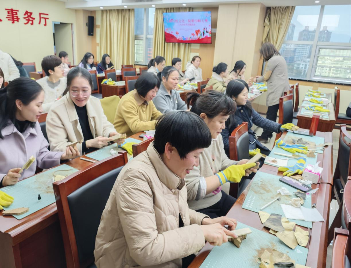 活動現(xiàn)場,軟木畫專家對國家非物質(zhì)文化遺產(chǎn)——福州“三絕”之一的軟木畫的文化、歷史及制作技藝進(jìn)行授課,隨后,全體女干部職工們在專家的指導(dǎo)下,一邊聆聽非遺文化,一邊認(rèn)真打磨,在方寸間感受手造福州軟木畫魅力和傳統(tǒng)文化的博大精深,在沉浸式體驗軟木康養(yǎng)梳和擴(kuò)香器的制作中,探尋一塊木頭如何變成一幅絢麗的“無聲的詩,立體的畫”。