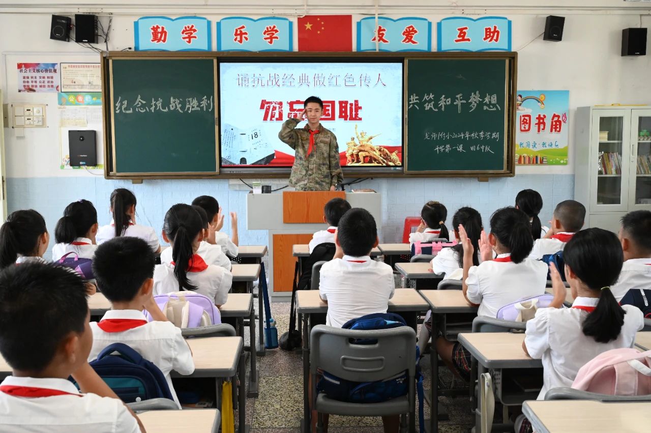 9月2日上午,福建省龍溪師范學校附屬小學兩個子弟兵中隊班開啟別樣“開學第一課”,邀請國防教育校外輔導員擔任臨時老師,以圖片視頻相結(jié)合的形式,聲情并茂地為學生們講述了抗戰(zhàn)歷史,引導他們從小樹立愛國意識,好好學習,奮發(fā)圖強,長大后報效祖國。