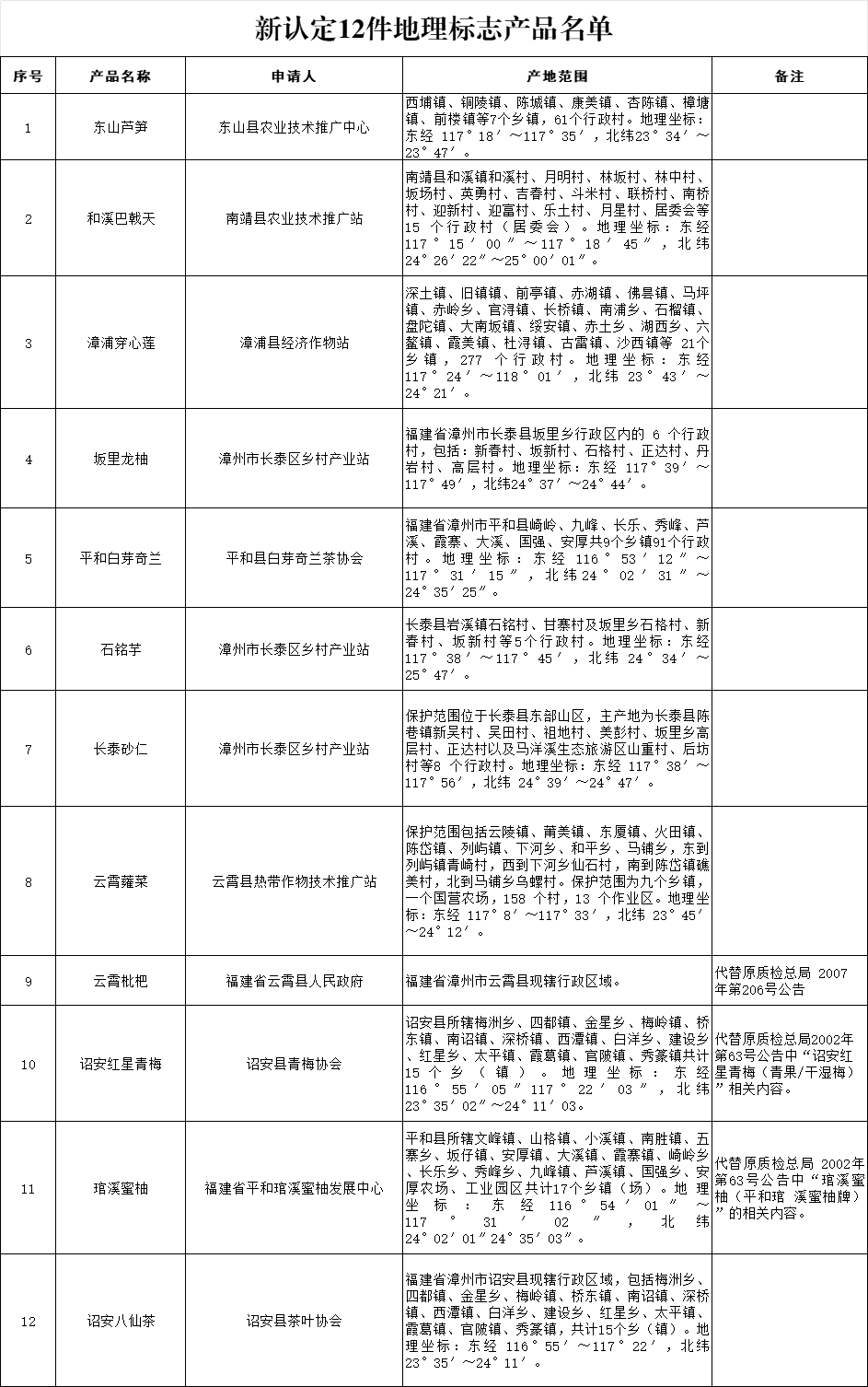 近日,國家知識產(chǎn)權(quán)局發(fā)布第640號公告和第642號公告,認定漳州市12件農(nóng)產(chǎn)品為地理標志產(chǎn)品,并核準生產(chǎn)相關產(chǎn)品的“福建東山華康食品有限公司”等103家企業(yè)使用地理標志專用標志,標志著漳州全面完成農(nóng)產(chǎn)品地理標志轉(zhuǎn)換工作。