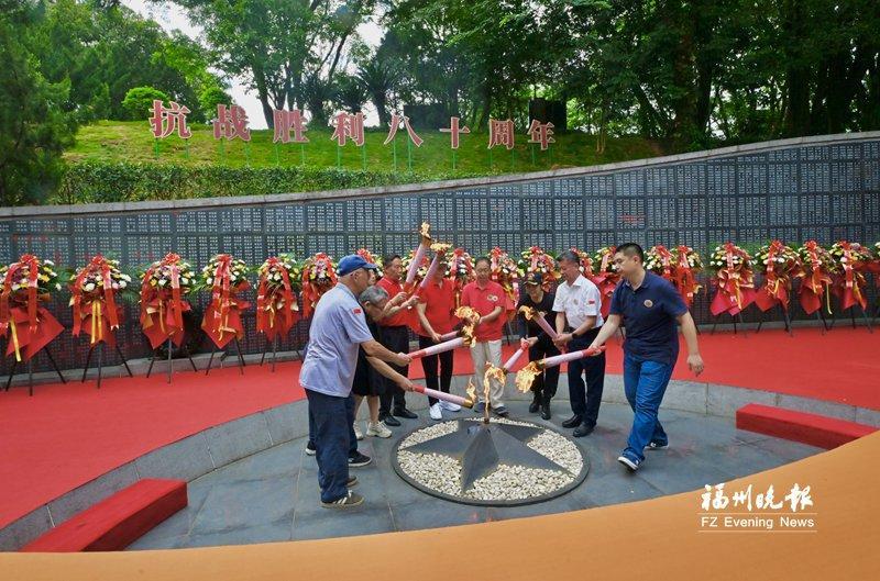 社會各界人士敬獻鮮花。 深切緬懷 燃傳承火種 佩戴起特制的抗戰(zhàn)勝利80周年紀(jì)念徽章,在紀(jì)念墻上鄭重簽名,與采集來的火種合影留念……8月31日8時許,福州抗日志士紀(jì)念墻前已是人頭攢動,早早來到這里的人們,以各種方式表達崇敬之情。 凝視福州抗日志士紀(jì)念墻,墻上8564個名字熠熠生輝,每一個名字背后,都是一位在民族危亡之際挺身而出的抗日志士,都有著一段可歌可泣的英雄故事?!拔腋赣H是抗日志士鄭其土?!编嵎礁稍诟赣H名字旁貼上小小的五星紅旗,“這是告慰先人的一種方式,我們沒有忘記他們,大家都沒忘記他們!”記者看到,許多抗日志士姓名旁都貼上了小小的五星紅旗。 戴著紀(jì)念徽章的兩位抗日志士——97歲姜汝煥和101歲陳世明的到來,吸引了眾人的目光。“很高興,看到很多熟人?!标愂烂餍呛堑啬贸鲈缫褜懞玫膬蓮堉杏⑽念}字贈與福建省閩浙贛邊區(qū)革命史研究會會長凌冰。一張寫著“大力弘揚偉大抗戰(zhàn)精神”,一張寫著“銘記歷史 緬懷先烈”,這是老人對后輩的諄諄囑托。 9時03分,穿透時空的號角聲響起。這號角,是告慰,亦是召喚,喚醒人們共同的歷史記憶?!皠倮亢推健o(jì)念中國人民抗日戰(zhàn)爭暨世界反法西斯戰(zhàn)爭勝利80周年活動”在號角聲中拉開帷幕。隨后,全場肅立,《義勇軍進行曲》的激昂旋律回蕩在紀(jì)念園上空,嘉賓們向福州抗日志士紀(jì)念墻行注目禮,用最莊重的方式致敬英烈。 活動現(xiàn)場,工作人員向抗日志士姜汝煥和陳世明獻花;主辦方及參與單位代表向紀(jì)念墻敬獻花籃并整理綬帶。朵朵鮮花寄托哀思,條條綬帶承載敬意,訴說著后人們對前輩先烈的深切緬懷。 抗戰(zhàn)的精神需要薪火相傳。現(xiàn)場大屏幕上播放的“薪火八閩”采集視頻,帶領(lǐng)大家回顧1個月來的火種采集歷程——從福州八一七烈士墓到福建省閩浙贛邊區(qū)革命紀(jì)念碑、福建省閩粵贛邊區(qū)革命紀(jì)念碑,從閩侯大湖抗戰(zhàn)遺址到陳紹寬上將故居、福州解放紀(jì)念碑、福州長江支隊紀(jì)念園,每一處都是一段悲壯史詩,每一簇火苗都是一粒不滅的精神種子。 在眾人注視下,抗日志士姜汝煥和陳世明從火種臺引出火種,并為9位抗日志士后人點燃火炬,再由他們共同執(zhí)火炬點燃“抗戰(zhàn)精神傳承長明火”。跳躍的火焰升騰而起,象征著無數(shù)抗日志士用鮮血和犧牲鑄就的抗戰(zhàn)精神將在一代又一代后人手中永續(xù)傳承、永不熄滅。