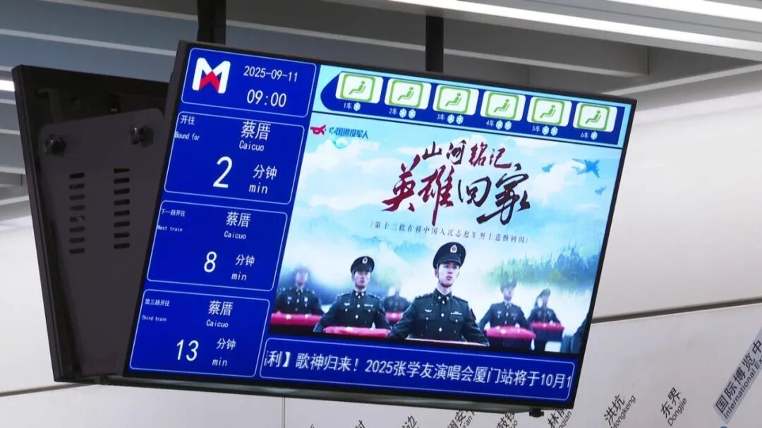 為弘揚(yáng)偉大的抗美援朝精神 在全社會(huì)營造崇尚英雄 學(xué)習(xí)英雄的濃厚氛圍 9月11日至13日 廈門在公交、地鐵、樓宇 碼頭、城市主干道等 15000+塊屏幕 聯(lián)動(dòng)播放 “山河銘記 英雄回家”海報(bào) 共同迎接英雄回家
