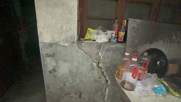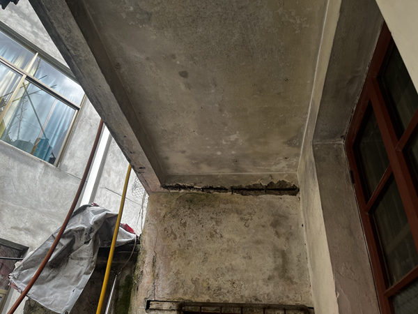 老舊房屋嚴(yán)重破損墻體開裂。(東南網(wǎng)記者 陳艷 攝) 老舊房屋現(xiàn)狀堪憂 在江東路旁,楊玉清的家臨街而立,背靠小山,位于坡路底部。房屋前低后高,設(shè)有兩個店面,分別用于出租和自營補(bǔ)胎業(yè)務(wù),均因地勢原因低于街道平面。見到記者,楊玉清急切地指引記者前去查看房屋現(xiàn)狀。 穿過店面是生活區(qū),映入眼簾的是殘破院子:地面裂縫縱橫交錯,墻面大面積脫落,廚房窗臺處有一道一米多長的裂痕貫穿而過;屋頂多處水泥剝落,鋼筋裸露在外,安全隱患重重。楊玉清指著頭頂一處裸露出的鋼筋道:“這里的水泥已經(jīng)霉?fàn)€了,這塊掉下來時正好砸在了我頭上?!?/span> 上到二樓,頭頂垂懸著的電線甚是醒目。三樓則是一家人的起居空間。其中一間已經(jīng)空置,天花板上是肉眼可見的裂痕,綠色的苔蘚順著裂縫的中心向外蔓延。在夫妻二人的指引下,記者還見到了房屋墻體分離、開裂等情形。 楊家七口人,因房屋安全隱患,兒媳已攜孫輩回娘家居住,大兒子也隨同前往。談及此,吳麗珍情緒激動,她堅(jiān)信房屋的破損與江東路的路面整改工程密不可分。她指出,江東路的路面分別于2004年和2024年進(jìn)行過路面改造,導(dǎo)致街道高于房屋60公分,雨水倒灌現(xiàn)象頻發(fā),加之施工震動,加速了房屋的老化與損壞。今年六月的一場持續(xù)降雨更是讓一樓幾乎被淹,嚴(yán)重影響了家庭的正常生活。